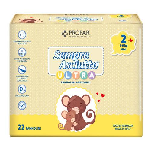 SEMPRE ASCIUTTO ULTRADescrizione Pannolino super assorbente e ultra dry. Ultra morbido a contatto con la pelle. Il nucleo assorbente, sottile e morbido, è formato da cellulosa sbiancata ecologicamente miscelata a SAP che assorbe i liquidi lasciando la cute del bambino asciutta. La forma anatomica del tampone, le doppie barriere laterali e il sistema di chiusura elasticizzata, aderiscono al corpo del bambino evitando fuoriuscite e lasciando libertà di movimento. Dermatologicamente testati. Formato Taglia 2 (3-6 kg). 22 pannolini.