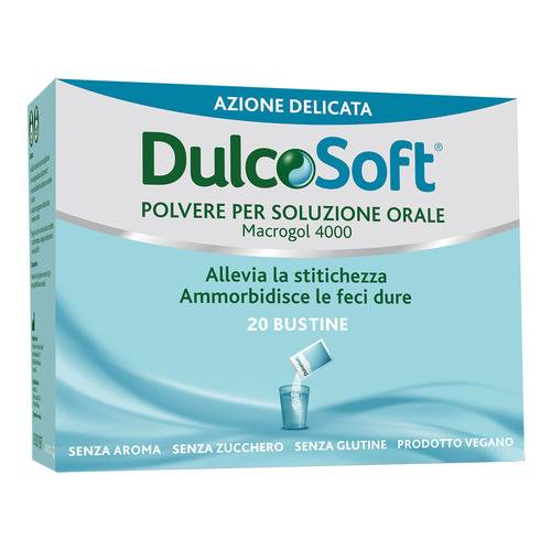DulcoSoft POLVERE PER SOLUZIONE ORALE Descrizione Dispositivo medico per il trattamento sintomatico della stitichezza occasionale e per ammorbidire le feci. DulcoSoft ha un'elevata capacità di reidratare e ammorbidire le feci dure, facilitandone l'evacuazione e dando una sensazione di sollievo. DulcoSoft ha un meccanismo di azione fisico e svolge la sua azione in maniera delicata: non viene assorbito dall'organismo e non dà origine alla produzione di gas. La componente principale è Macrogol 4000, un lassativo ad azione osmotica e che trattiene l'acqua. Agisce come trasportatore d'acqua e ne ritarda l'assorbimento intestinale, de...